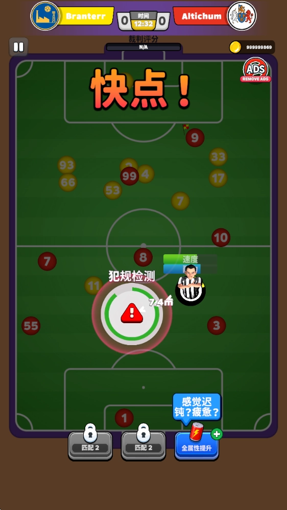 开球之后,拖动屏幕来控制裁判移动,一旦出现图中所示的警告提示,就要迅速靠近以完成判罚操作。