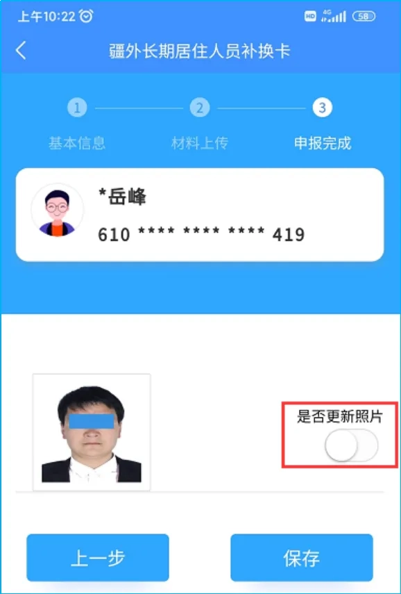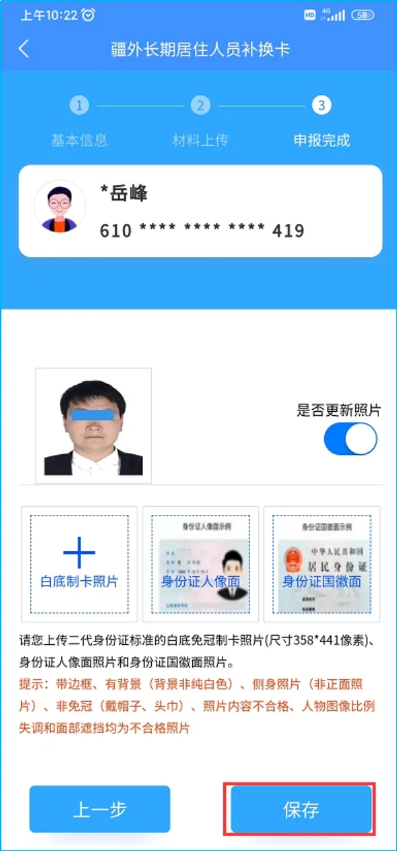 如果申请人需要更换制卡照片,可点击图(5)中“是否更新照片的”滑动按钮,应用程序展示如图(6)所示的界面,在此界面中,申请人需要上传满足制卡要求的照片和有效身份证件的正、反面照片。