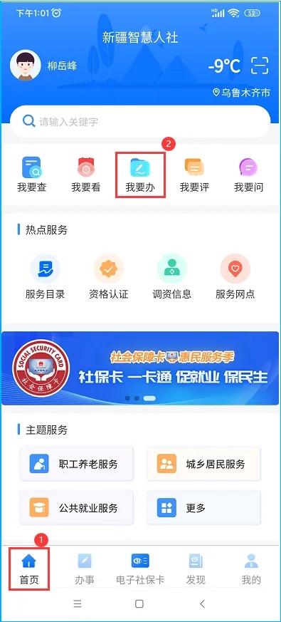 1. 登录“新疆智慧人社”手机APP,进入主界面,在首页点击“我要办”,接着点击“社会保障卡”,这时就能看到“疆外长期居住人员社保卡补换”与“疆内异地长期居住人员社保卡补换”这两个模块,如图(1)、图(2)所示。用户可依据自身长期居住地址的实际状况,选择不同模块来申办社保卡补换业务。