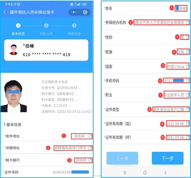 申请人根据个人有效证件,逐一核对图(4)中标记的信息项,对缺失和错误的信息进行补充、修改,填写完成后,点击“下一步”按钮,可进行制卡照片的查看。如图(5)所示。