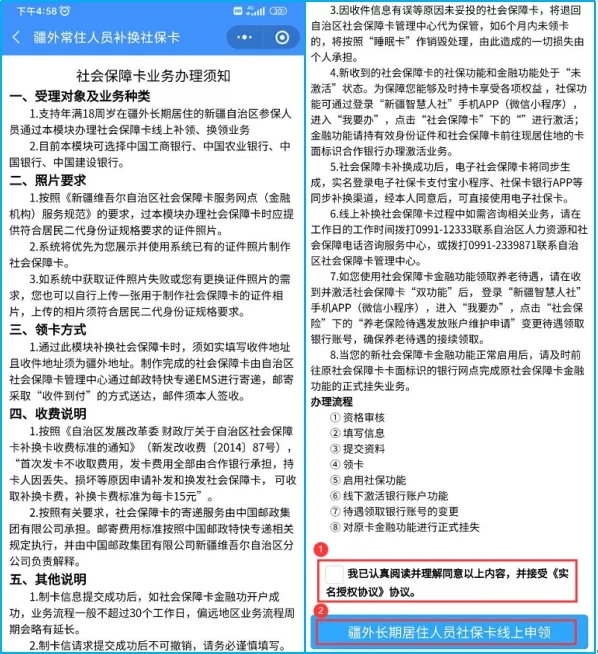 申请人需要认真阅读“社会保障卡业务办理须知”,并勾选图(3)底部所示的“我已认真阅读并理解同意以上内容,并接受《实名授权协议》协议”的选项,点击“疆外长期居住人员社保卡线上申领” 按钮,填写申领信息。如图(4)所示。