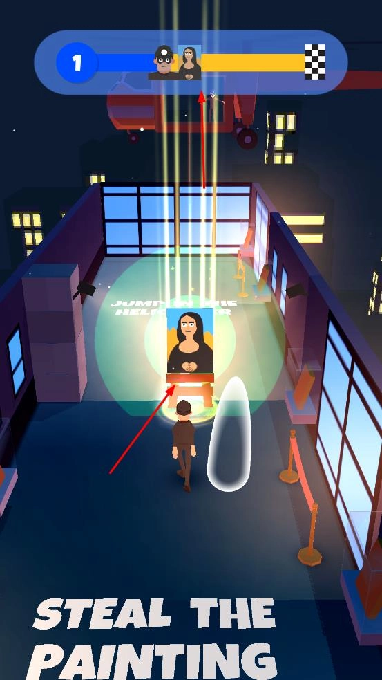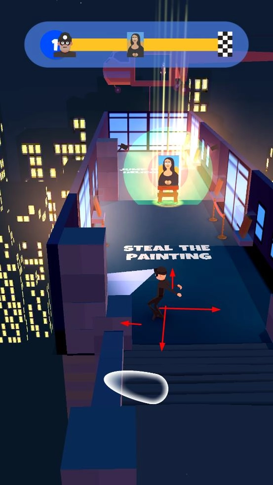 操控角色在夜晚的展厅里移动,按照“STEAL THE PAINTING”的提示,逐步靠近目标画作,为偷窃行动做准备。