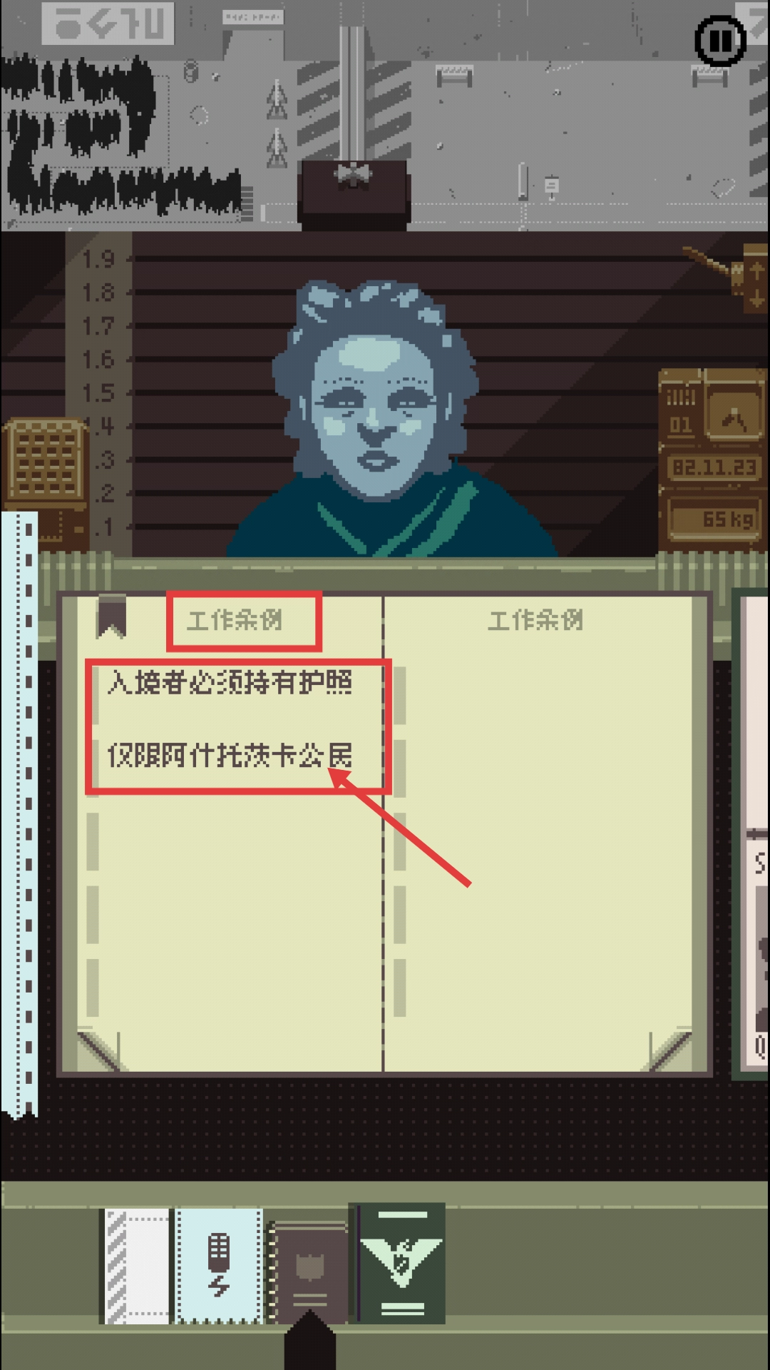 请严格依照【工作条例-入境者必须持有护照-仅限阿什托茨卡公民】的规定,对入境人员进行审查。