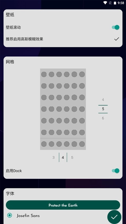 打开DNA桌面后,依次开启壁纸滚动、网格格式、字体设定等功能,最后点击右下角的确认图标即可。