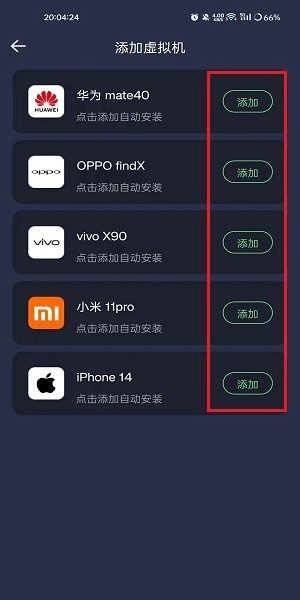 进入添加界面后,可选择华为、oppo、vivo、小米、苹果等不同主流手机型号。