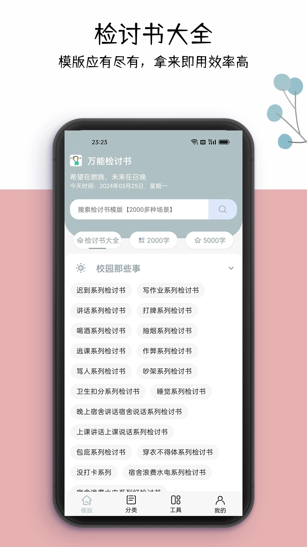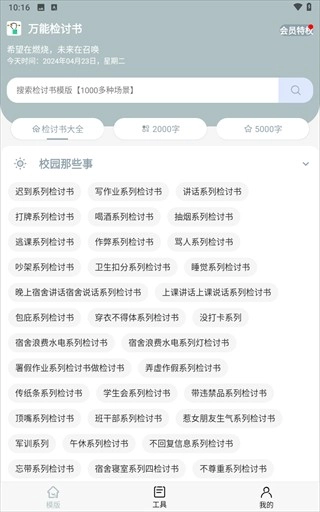 这款软件界面清新简约,全程打扰,别看它体量不大,功能却十分完备——不仅覆盖1000多种场景的检讨书模板,还支持300到1000字、2000字、3000字以及5000字的字数需求,诚邀您前来体验!