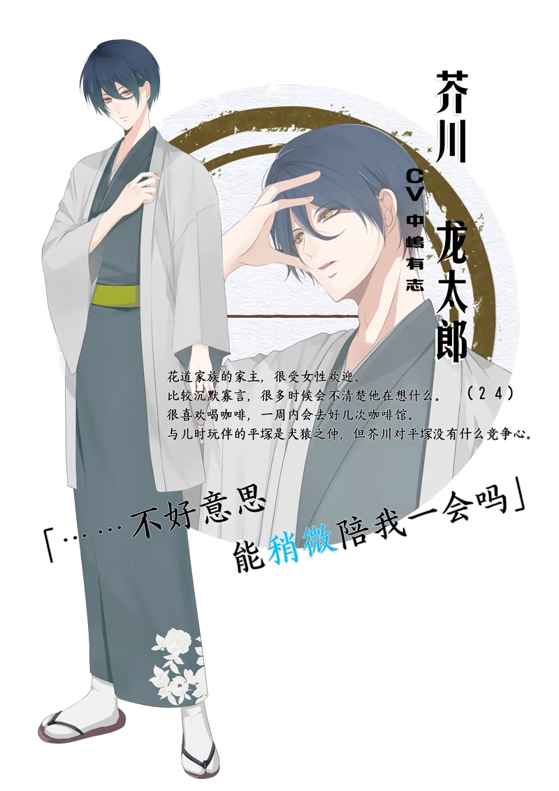 CV:中嶋 有志花道家族的家主,很受女性欢迎。(24岁)比较沉默寡言,很多时候会不清楚他在想什么。很喜欢喝咖啡,一周内会去好几次咖啡馆。与儿时玩伴的平塚是犬猿之仲,但芥川对平塚没有什么竞争心。