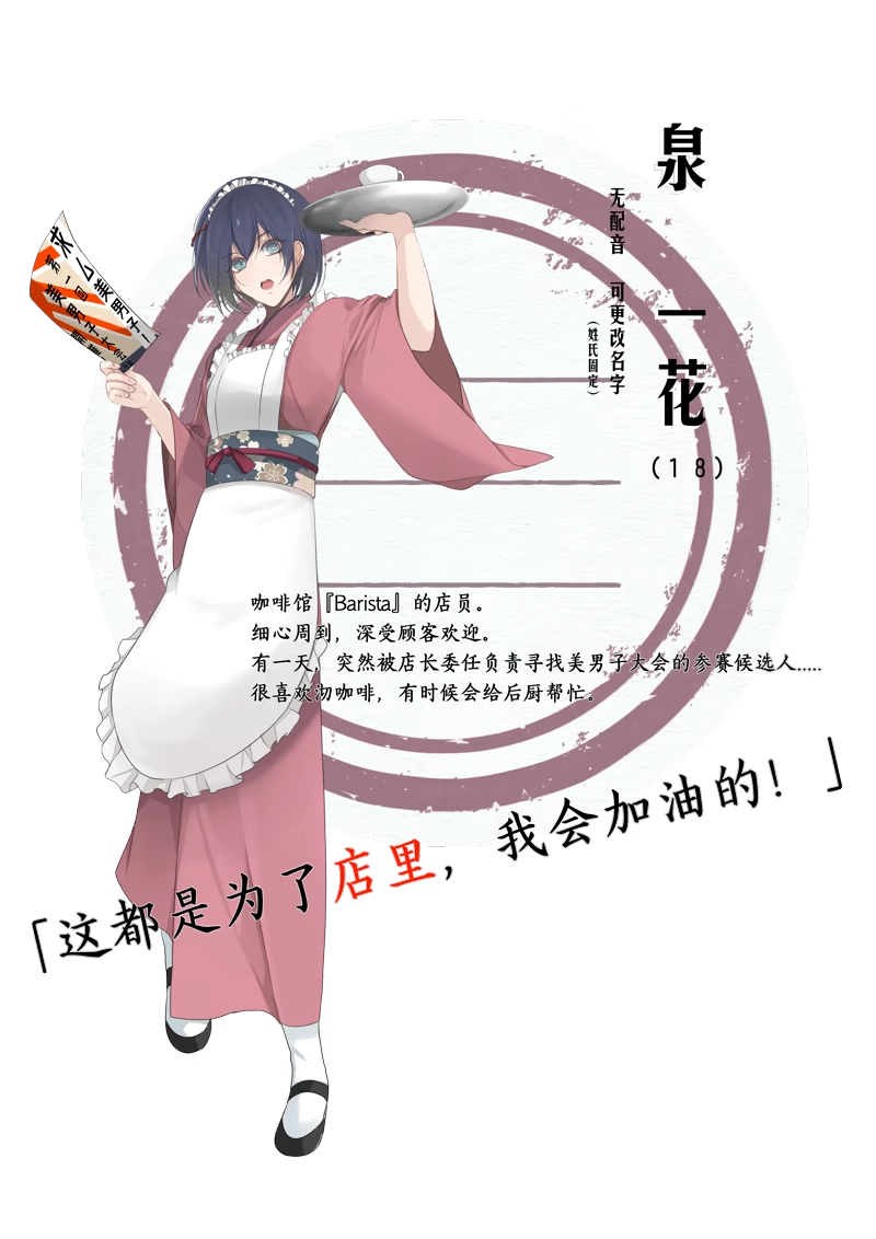 无cv咖啡馆『Barista』的店员。(18岁)细心周到,深受顾客欢迎。有一天,突然被店长委任负责寻找美男子大会的参赛候选人……很喜欢沏咖啡,有时候会给后厨帮忙。