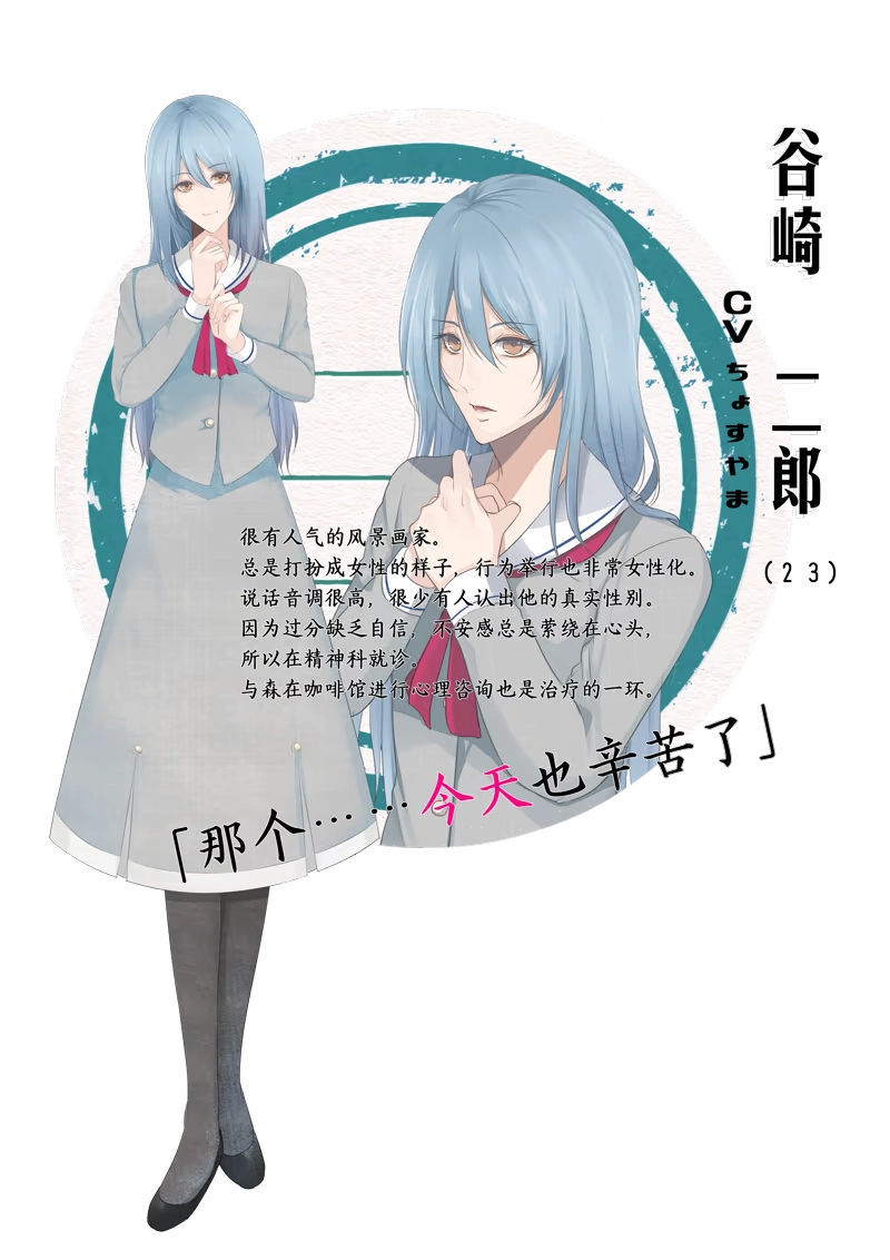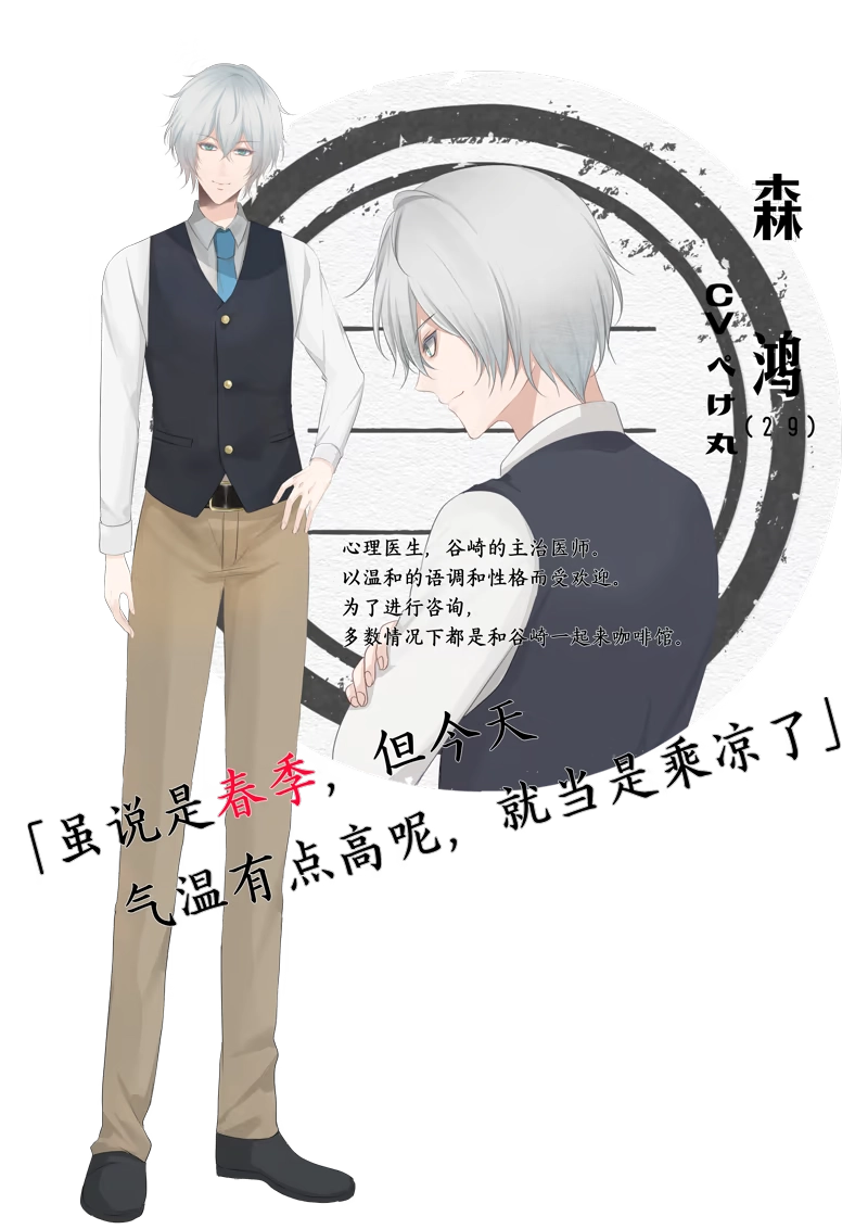 森 鸿CV:ぺけ丸心理医生,谷崎的主治医师。(29岁)以温和的语调和性格而受欢迎。为了进行咨询,多数情况下都是和谷崎一起来咖啡馆。