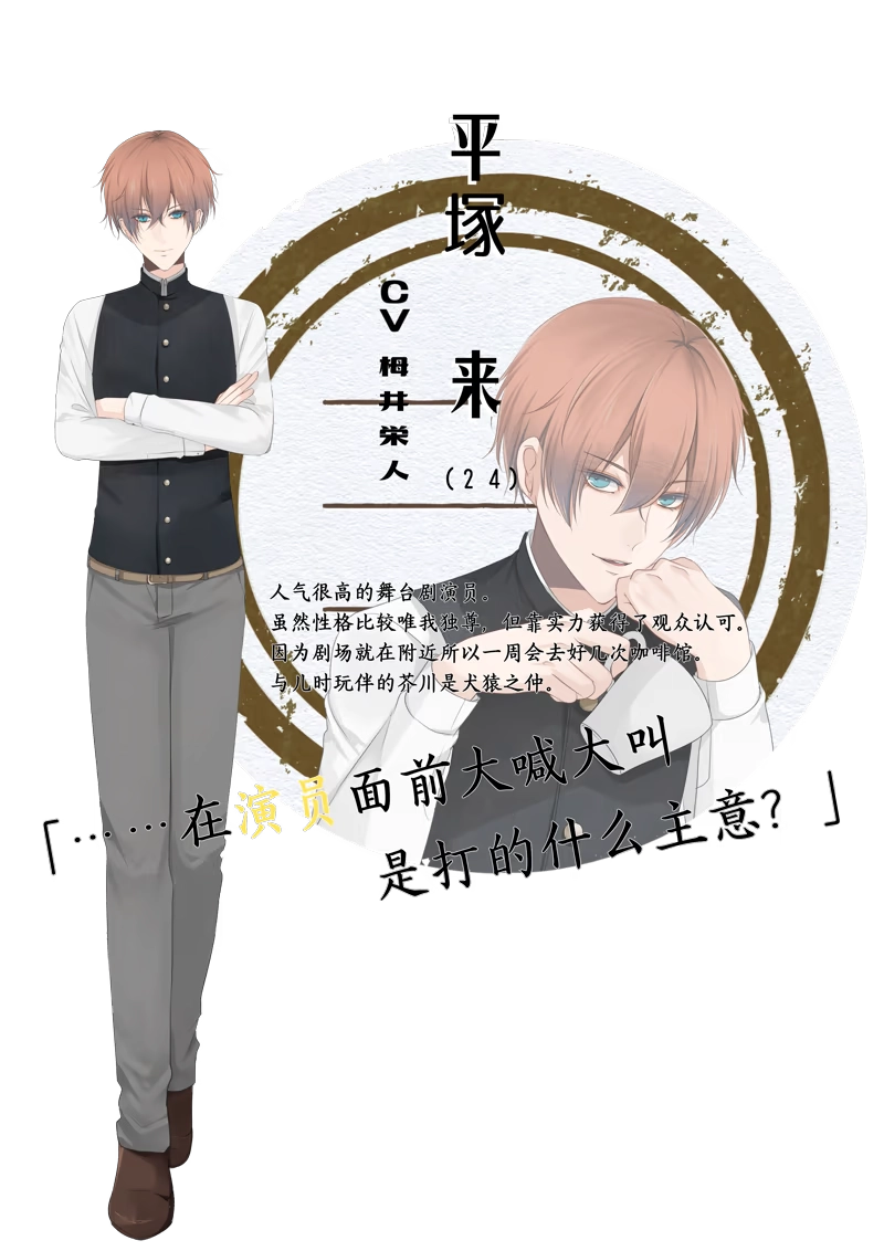 CV:栂井 栄人人气很高的舞台剧演员。(24岁)虽然性格比较唯我独尊。但靠实力获得了观众认可。因为剧场就在附近所以一周会去好几次咖啡馆。与儿时玩伴的芥川是犬猿之仲。
