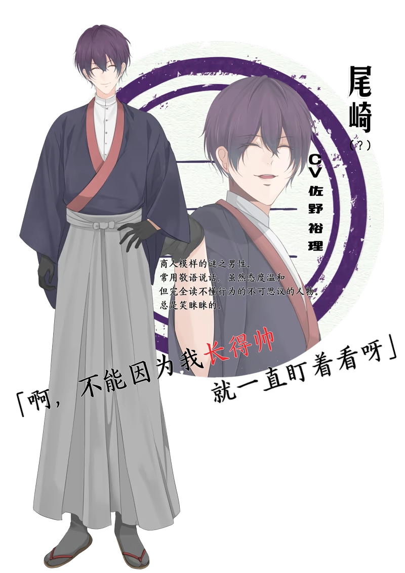 尾崎CV:佐野裕理 身着商人装扮的神秘男性。日常交谈惯用敬语,态度看似温和亲切,行为举止却全然令人捉摸不透,是个充满谜团的人物。脸上总是挂着笑意。