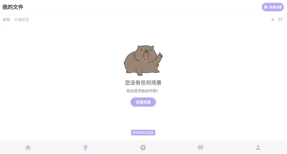 点击第二个按钮可查看个人模型文件,点击“新建场景”或“创建场景”即可自由发挥想象力进行创作。