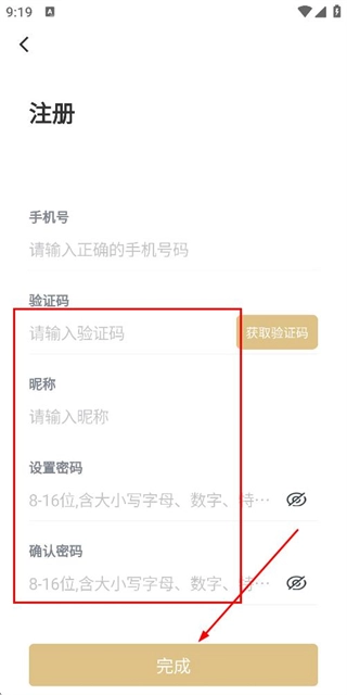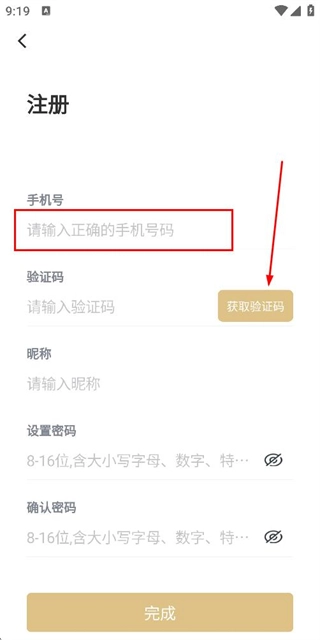 在账号注册页面填写验证码、昵称与密码,点击注册按钮即可完成注册流程。