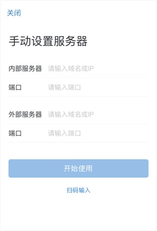 您可以手动设置所在企业的服务器,具体方式是填写内外部服务器的域名和端口信息。