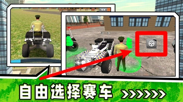 车辆选择:靠近目标车辆后点击方向盘图标就能上车,可自由切换车型和用途,以匹配不同的任务需求。