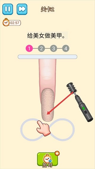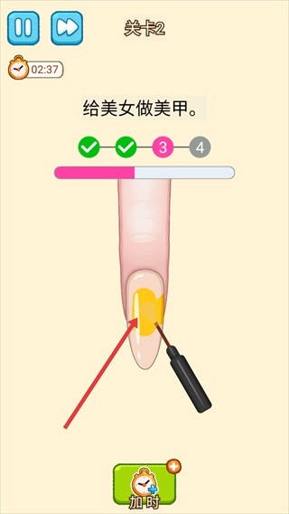 在关卡2“给美女做美甲”的任务里,依据提示步骤,先对指甲进行处理。