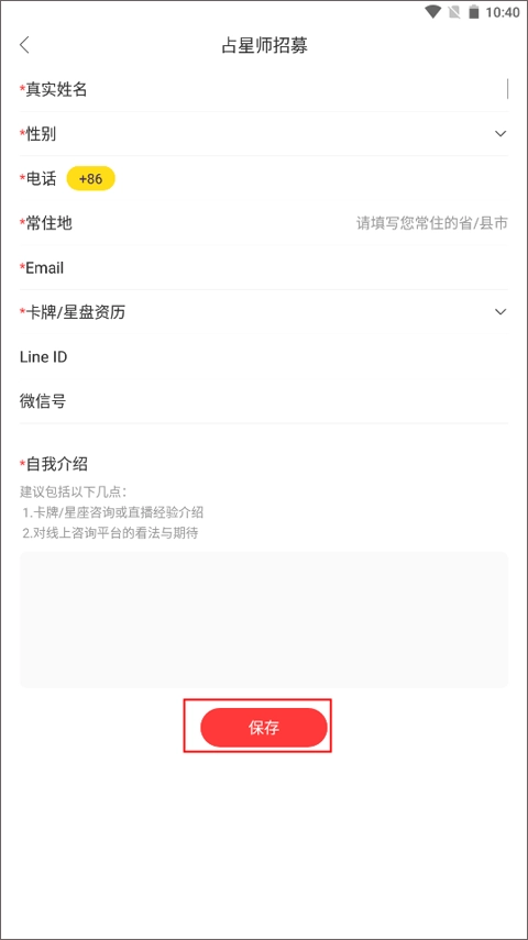 在招募页面填写真实姓名、性别、联系方式、居住地、邮箱、星盘或卡牌相关背景等详细信息,同时补充个人简介,确认信息准确无误后点击保存并提交。