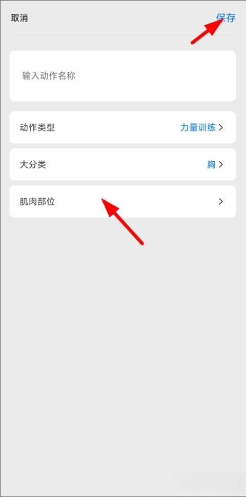 用户进入新增动作的页面后,输入动作名称,接着选择类型、分类、部位等信息,最后点击页面右上角的保存按钮即可。