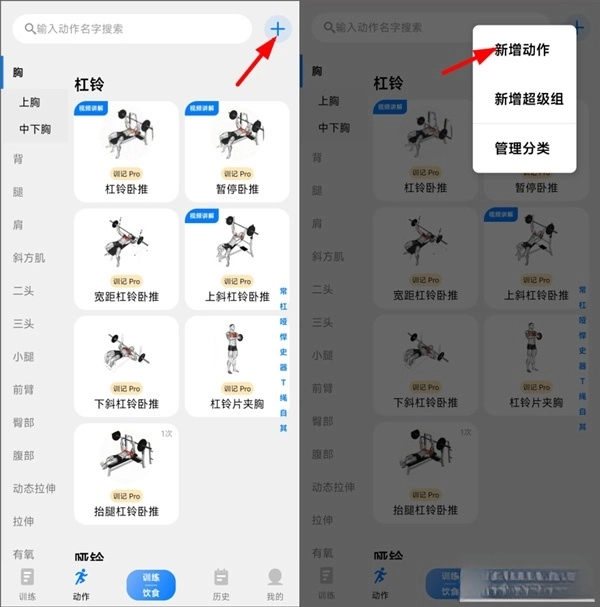 打开锻炼动作界面后,用户能浏览到各类不同的运动动作,点击右上角的“+”按钮,在弹出的下拉菜单中选择新增动作选项即可。
