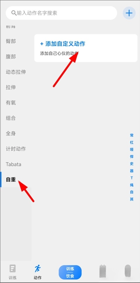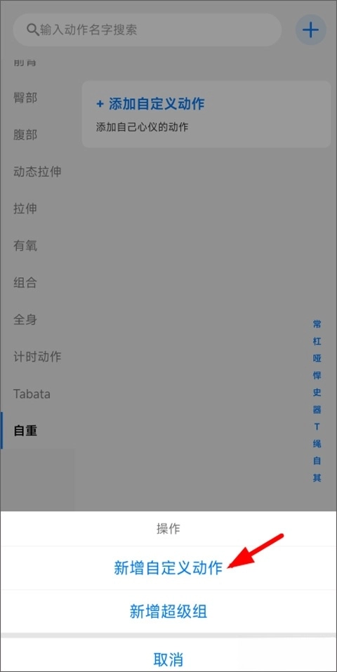 在动作页面左侧的肌肉部位栏下拉到“自重”选项,接着点击添加自定义动作。