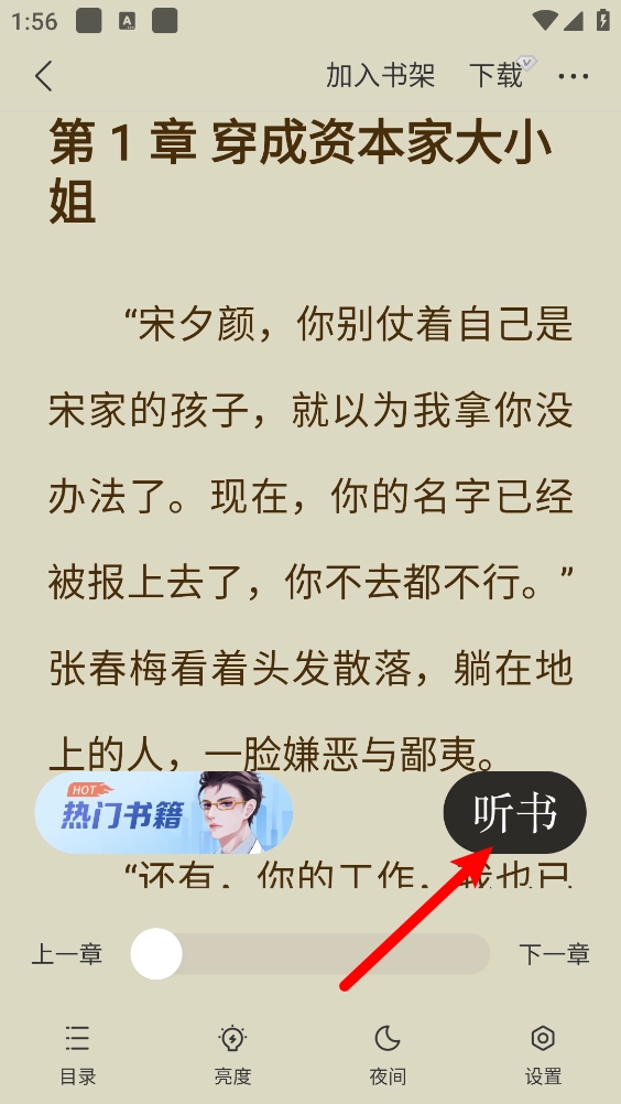 进入阅读界面点击中间区域呼出菜单,点击"听"。