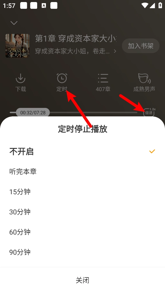 支持倍数听书和定时听书进行设置。