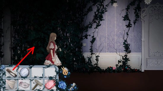 之后回到左边的入口处,打开道具栏,选中匕首,接着点击墙上密布的藤蔓,大约点击三次,就可以把藤蔓割断了。