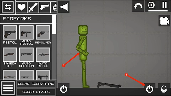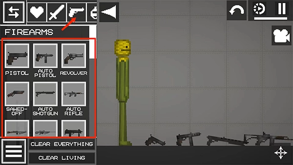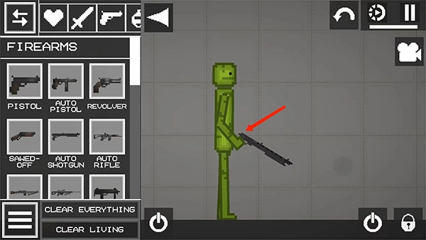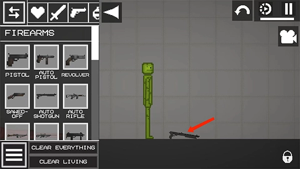 接下来,我们在菜单界面找到【枪】的图标并点击,然后挑选一把枪,将其拖动到地面上。