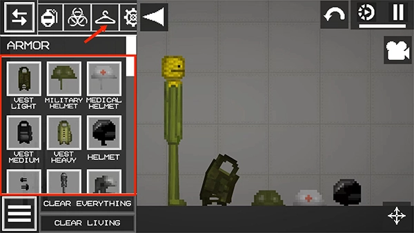 选择【衣架】图标,其中包含防弹衣、安全帽、头盔等各类不同的防护装备。