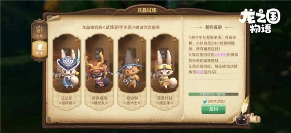 首次签约仅需30蓝钻,每完成16次试炼就能免费签约1次。签约试炼助手小队后,就能享受它们24小时随时待命的协助啦!