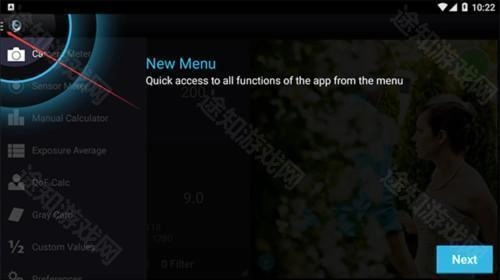 打开lightmeter后,点击界面左上角的按钮就能调出菜单栏,从而快速使用应用程序的各项功能。