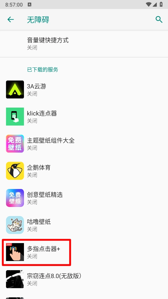 跳转至"无障碍"页面打开"多指点击器"。