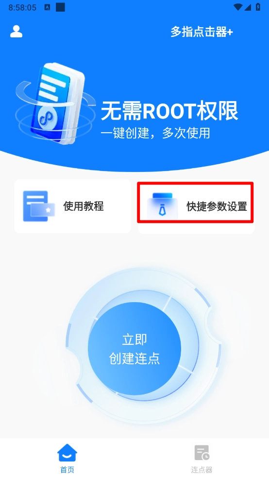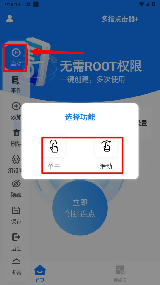 创建连点功能:用户可自定义点击的位置、频率以及触控点数,并且支持由用户主动触发的点击模式。