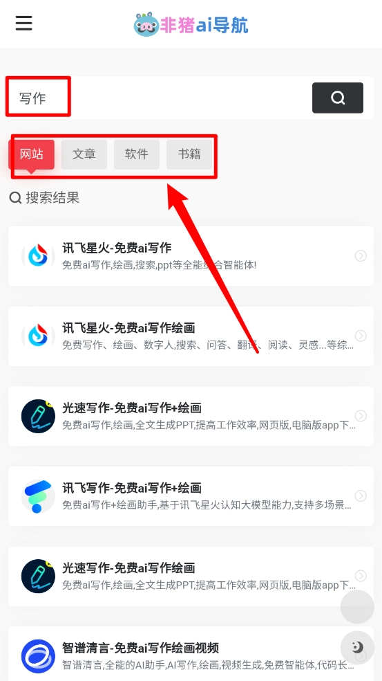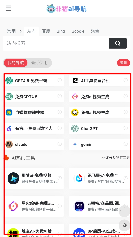 非猪ai导航,非猪AI导航是一个专注于国内外AI工具分享的资源平台,这里汇聚了全网各类实用AI工具,涵盖写作助手、图片生成、视频剪辑、编程辅助等多种类型,让你无需再在全网各处搜寻。平台界面简洁清爽,每天都会更新最新上线的AI神器,所有工具都无需安装,只需一键点击就能直接跳转使用。
