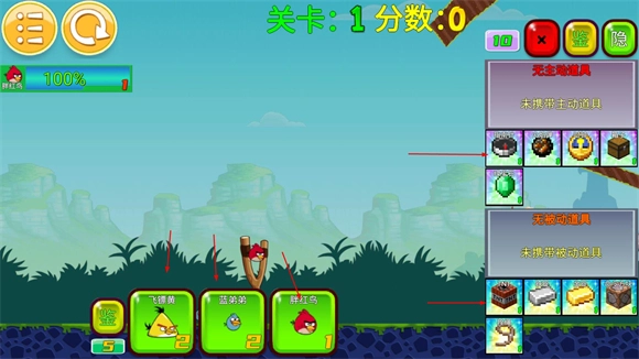 进入关卡后,下方可切换当前使用的小鸟种类,右侧则能选择主动道具与被动道具。