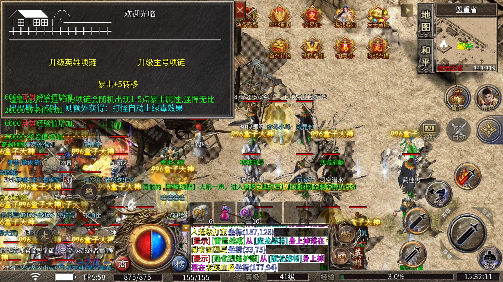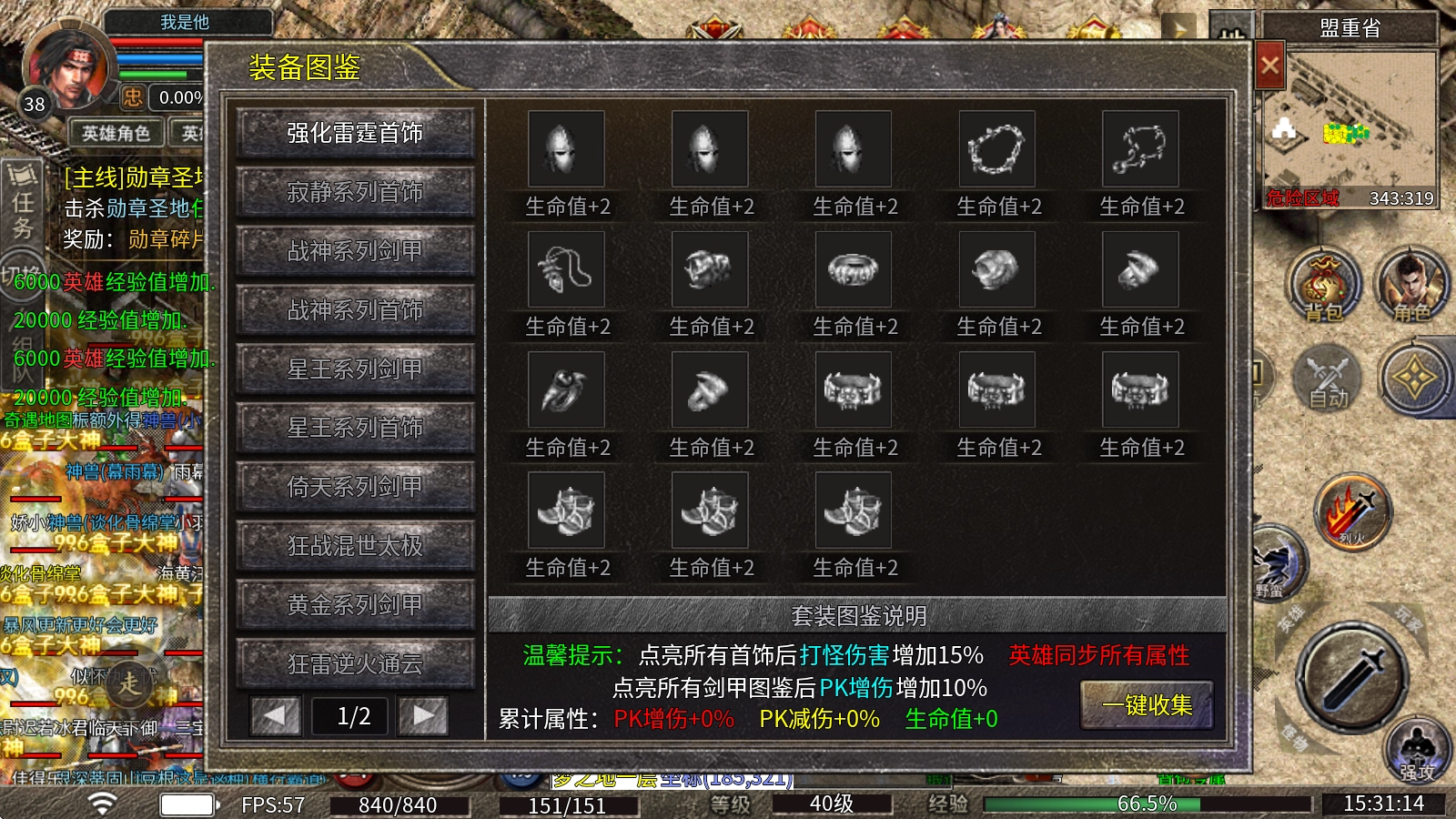 装备图鉴:打怪爆出的装备,如有多余的可以放入图鉴中,点亮所有首饰后打怪伤害增加15%,点亮所有剑甲图鉴后PK增伤增加10%,英雄同步所有属性。