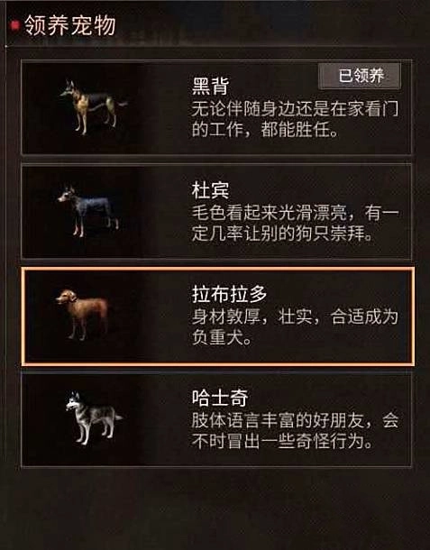 很多新手刚开始选狗狗时容易选错,其实狗狗分三种属性:第一种是看门型,也就是常说的看门狗;第二种是搜索型,能在户外帮玩家找物资;最后一种是负重型。前期建议选搜索型,不过就算前期选了其他类型也没关系,后期花点新币就能改宠物狗的属性——要是前期选对了,后期不就不用浪费新币了嘛。