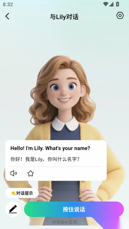 拥有海量话题储备的AI私教Lily,全天候24小时随时在线陪聊。担心开口难?贴心提示会随时为你提供帮助!在这里,不存在对错之分,只有满满的鼓励与持续的进步。