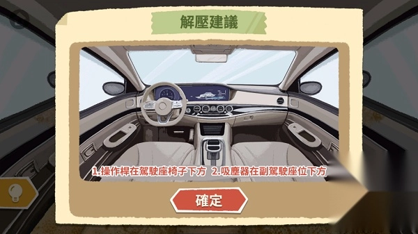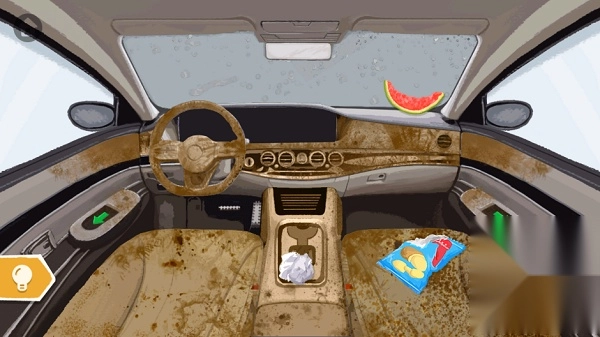 接下来点击左侧的绿色按钮,继续清理座椅下方的垃圾。打开副驾驶的抽屉,里面的垃圾也需要清理,清理时可以使用蓝色吸尘器。