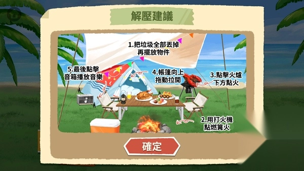 点击右边的背包,打开折叠椅、帐篷等物品,并摆放好
