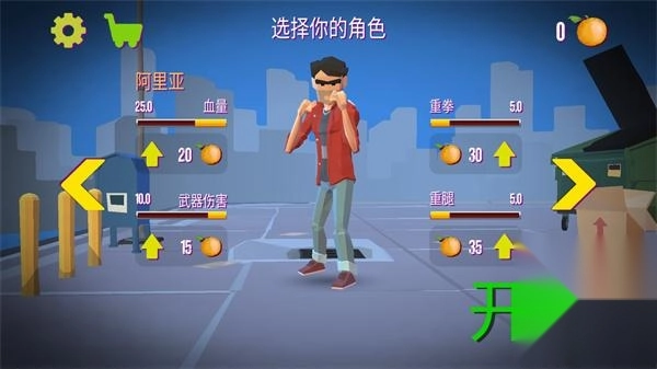 1、初入暴力街区之拳王游戏的玩家,需选定你的角色,虽然游戏内提供的数十种角色选择,但前期只有两位是免费的,后续角色的解锁需要玩家收集橘子才能开启。