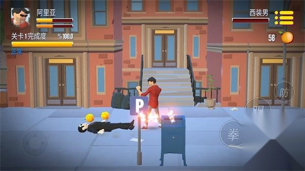 《暴力街区》是一款自由度拉满的动作格斗闯关游戏,玩家得熟练掌握各类拳脚招式与组合技能,通过巧妙运用来爆发出更强的战力,把敌人成功打倒就能拿下关卡胜利。另外,玩家还能利用战斗获胜后掉落的橘子道具给角色升级,去挑战更多更厉害的BOSS。