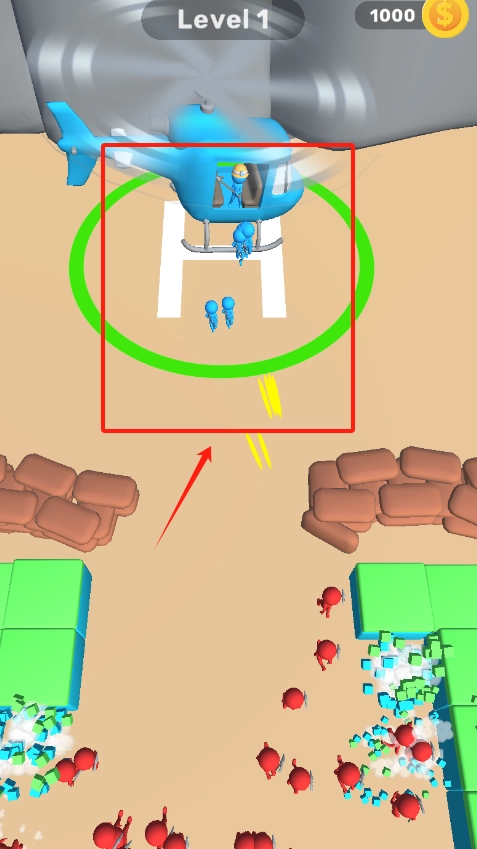 注意到停机坪上那架蓝色的直升机了吗?点击它,让它起飞后避开障碍物,把士兵安全送到目的地。