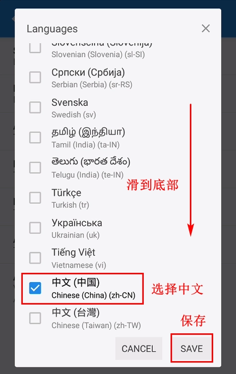 中文选项位于列表底部,请勾选“中文(中国)”,之后点击保存按钮。