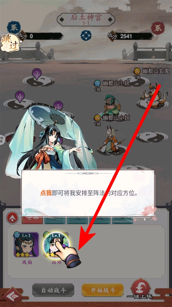 2、战斗开启前进入布阵阶段,下方栏展示可上阵角色如风雨师,点击角色,可将其安排至阵法的对应方位,合理搭配角色阵容,能提升队伍战力应对敌人进攻。