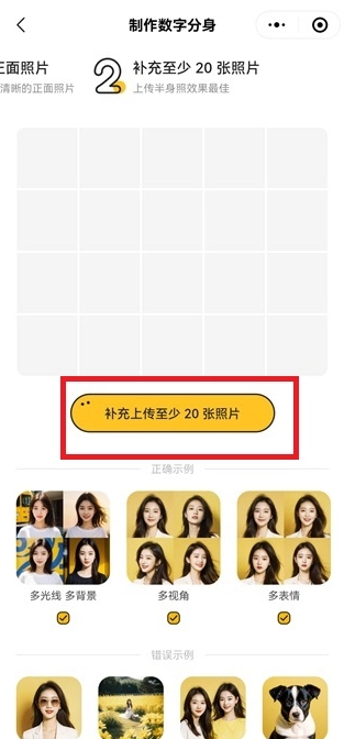 上传成功后,请补充上传20张同一人的照片,要求这些照片需展现该人物不同的角度与表情。