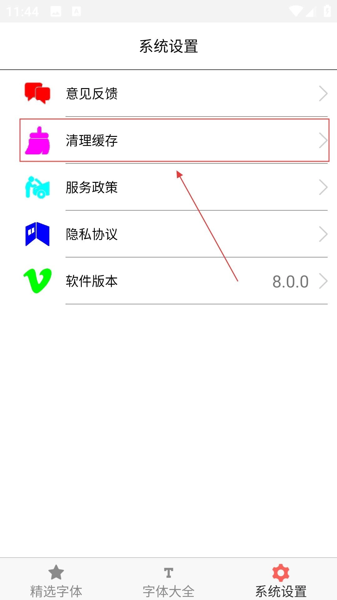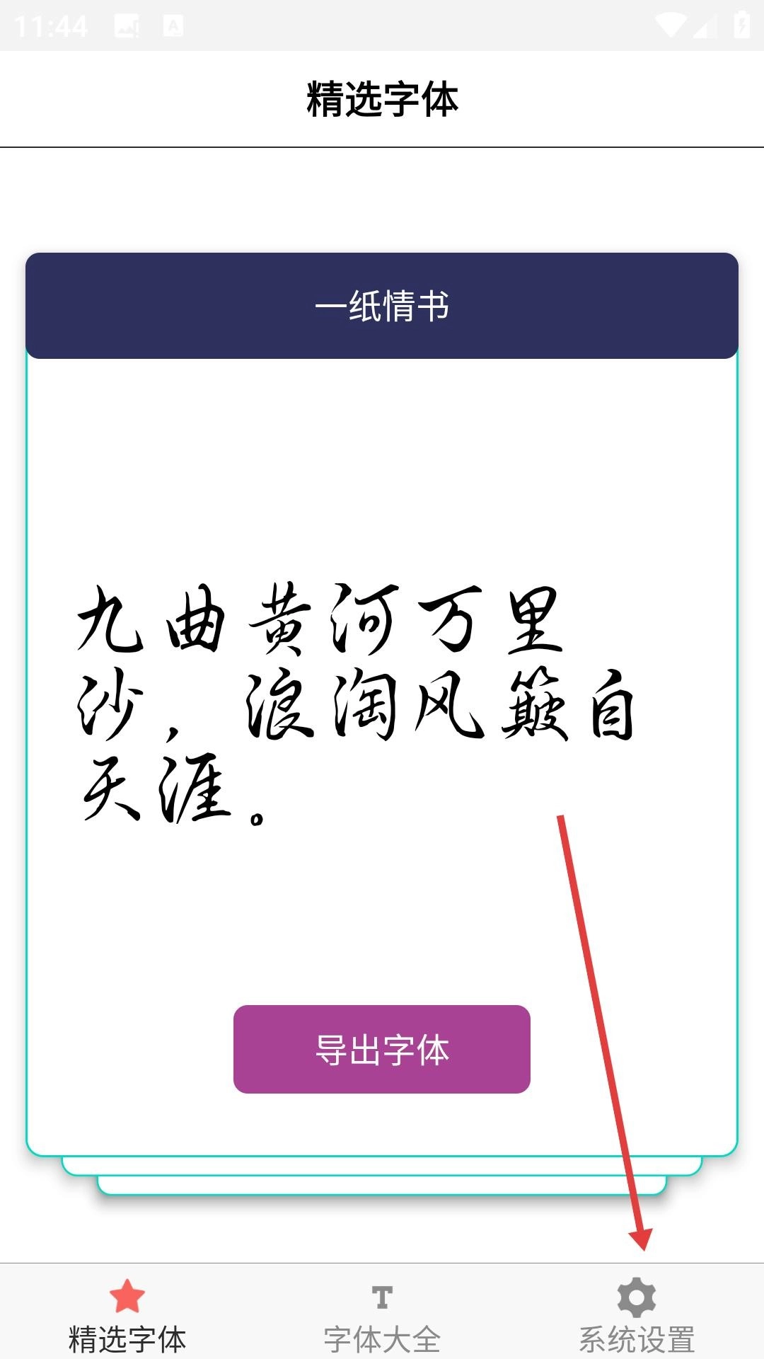 字体库大全绿色版,进入精选字体页面,挑选好喜欢的字体后点击导出字体,把字体保存到设备里;接着点击右下角的设置按钮,进入设置界面。