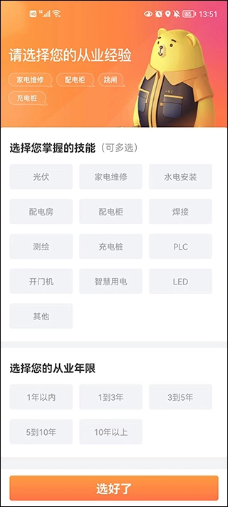 对于e电工平台的电工师傅们,可以选择自己擅长的专属领域技能以及自身的行业从业年限,这样系统就能为您分配更契合您能力与经验的订单了。