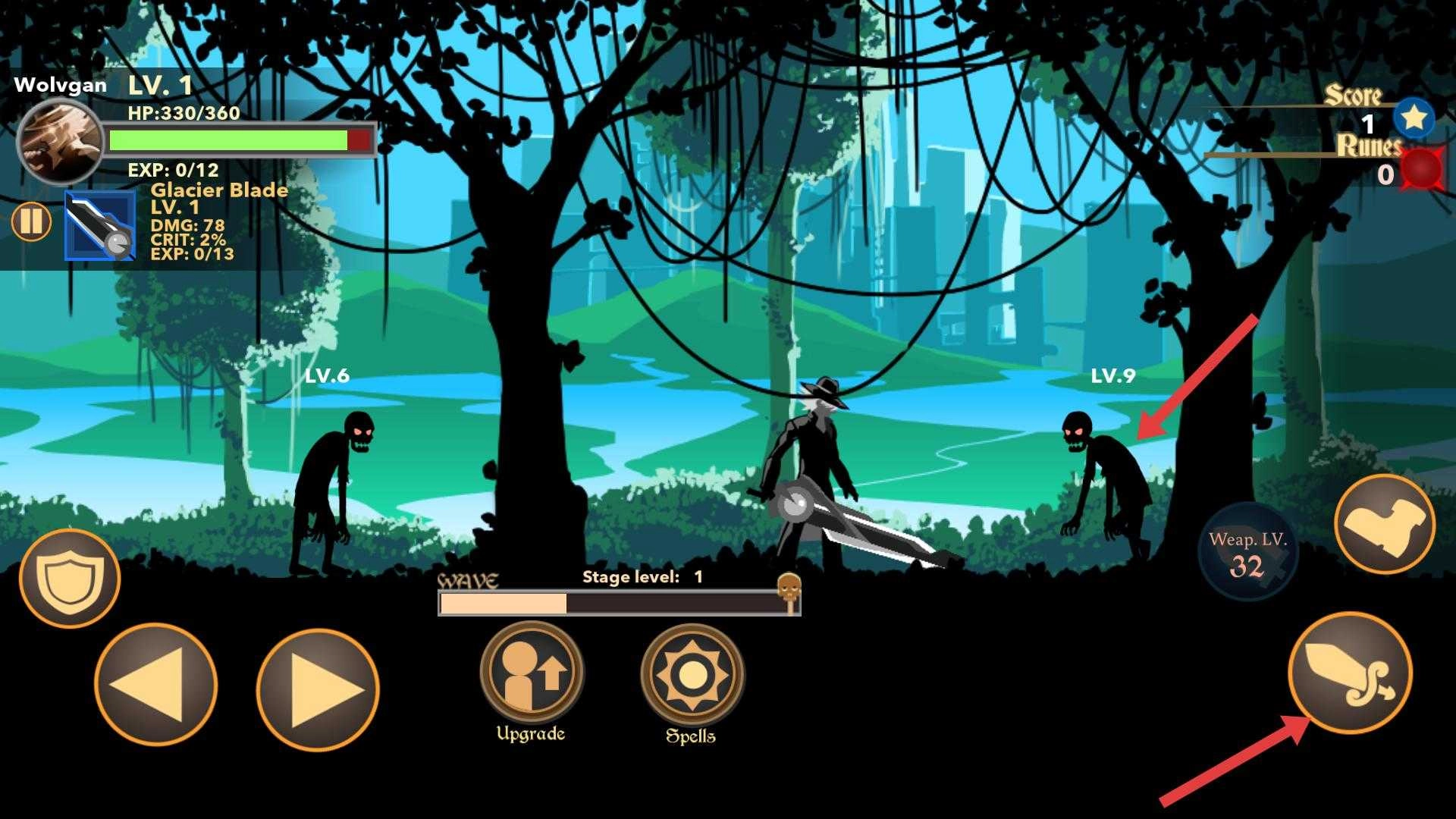 3、遭遇敌人时,点击右侧攻击按钮对敌人发动攻击,根据敌人位置和数量,合理使用技能,快速清除怪物获取分数和符文。