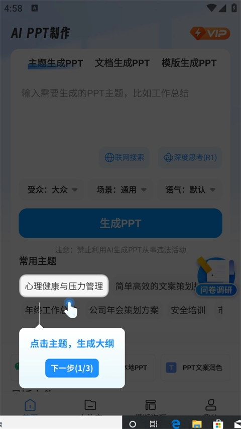 学生群体不仅能满足自身在社团活动中的介绍、招募PPT需求,还能依据课题研究及小组讨论成果展开分析,制作出契合大学生研究课题的汇报PPT、毕业设计PPT等。